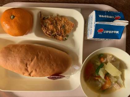 【今日の献立】食パン(いちごジャム) 牛乳 鶏肉とじゃがいものスー