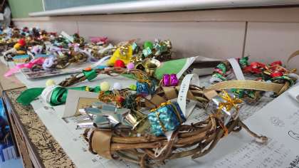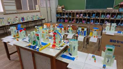 2年生はとなりの学習室に紙工作の建物とリースを展示しています。