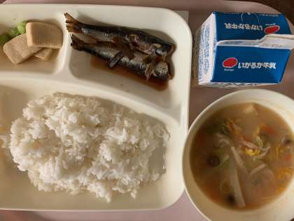 【今日の献立】ごはん 牛乳 いわしのしょうが煮 みそ汁 高野どうふ