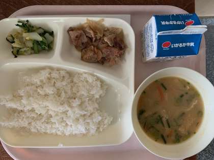 【今日の献立】ごはん 牛乳 豚肉のしょうが焼き さつまいものみそ汁