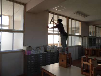 普段では手の届かない高所や屋外に面する窓もきれいに清掃し、3学期からの学習が気持ちよくスタートできるよう整備を進めています。