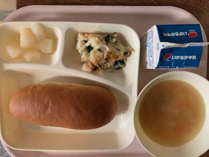 【今日の献立】黒糖パン 牛乳 ほたて貝のグラタン スープ