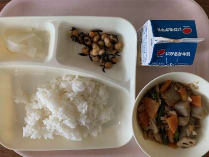 【今日の献立】ごはん 牛乳 筑前煮 ひじき豆 だいこんのゆず風味