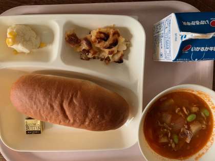 【今日の献立】コッペパン(バター) 牛乳 豚肉と野菜のケチャップ煮