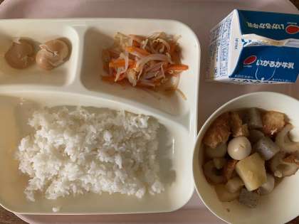 【今日の献立】ごはん 牛乳 関東煮 甘酢あえ 白花豆の煮もの