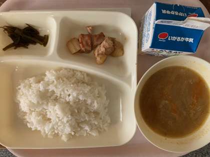 【今日の献立】ごはん 牛乳 まぐろの甘辛焼き 豚汁 くきわかめの