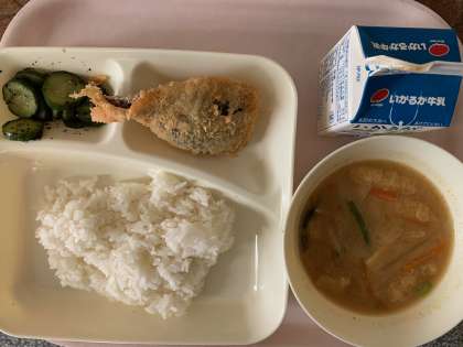 【今日の献立】ごはん 牛乳 いわしのフライ みそ汁 きゅうりの赤じそあえ