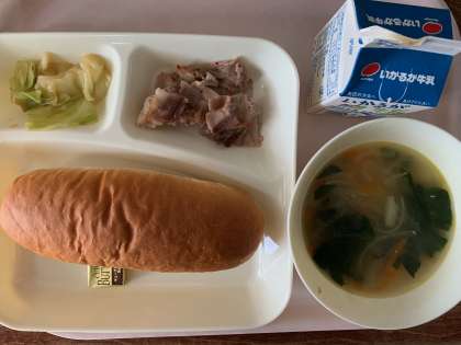 【今日の献立】コッペパン(バター) 牛乳 豚肉のガーリック焼き スープ