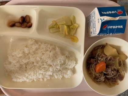 【今日の献立】ごはん 牛乳 肉じゃが はくさいのゆず風味 とら豆の