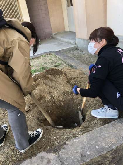 6年生の保護者の方を中心に、さまざま行事が中止となった6年生の思い出づくりにとタイムカプセルをやらせたいという声があがり、急遽実施することとしました。保護者の方に穴を掘っていただきました。6年後の自分にあてた手紙をいれて埋める予定です。