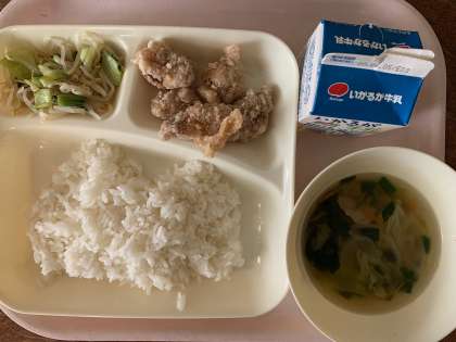 【今日の献立】ごはん 鶏肉のからあげ 中華スープ チンゲンサイと