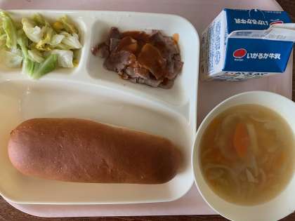 【今日の献立】黒糖パン 豚肉のデミグラスソース スープ キャベツと