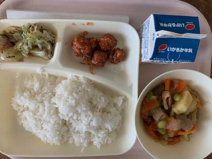 【今日の献立】ごはん まぐろのオーロラ煮 含め煮 キャベツの赤じそ