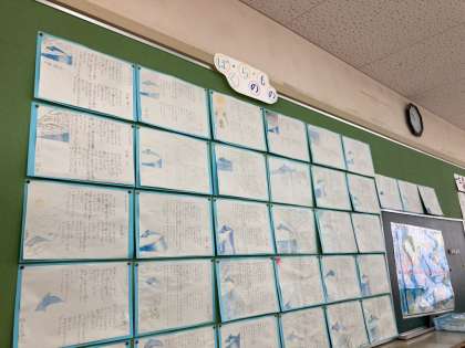 各学級では児童の作品や作文を掲示しています。自分以外の人の作品を見たり、考えを知ることが集団生活では大事であると考えています。
