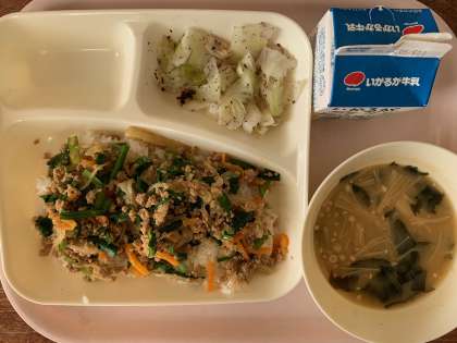 【今日の献立】ごはん 豚ひき肉とにらのそぼろ丼 みそ汁 キャベツの