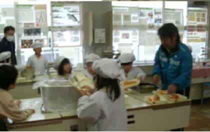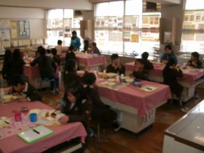 この期間、日替わりで学級ごとに「天下茶屋レストラン」で給食をいただきます。