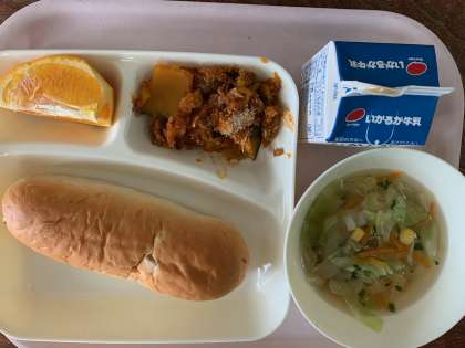 【今日の献立】おさつパン かぼちゃのミートグラタン スープ