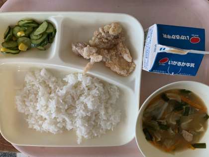 【今日の献立】ごはん 鶏肉のからあげ 中華みそスープ きゅうりと