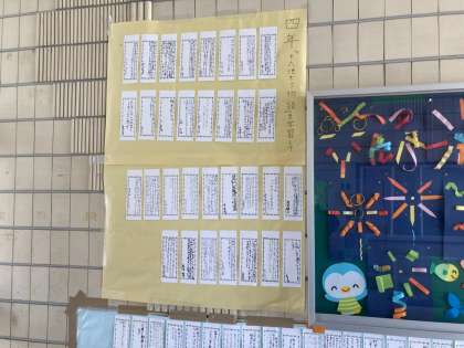 「ピースてんがちゃや」の振り返りで児童が作成した短冊ですが、全学年がそろいました。玄関ホールに展示してあります。来られたついでに見てください。