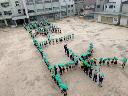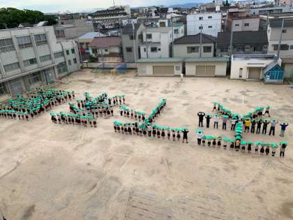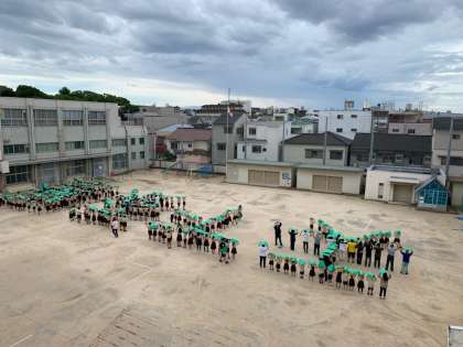 いい写真ができるように、みんなで力をあわせて…ヘリコプターを見てて頭が映っていますよ。「天下茶屋」できています。