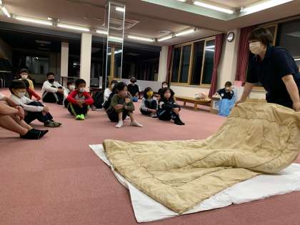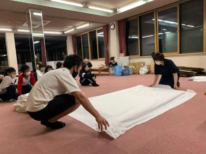 休む間もなく、室長さんは食堂で布団の敷き方、片付け方を教えてもらい部屋に戻りみんなに伝えます!
