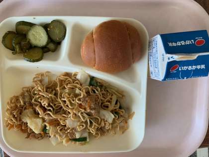【今日の献立】黒糖小パン オイスターソース焼きそば きゅうりの中華