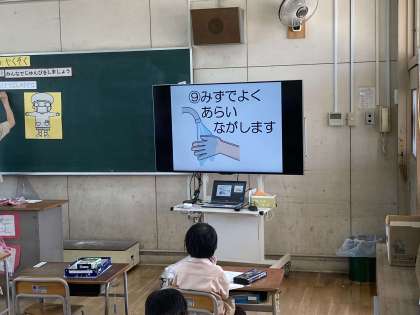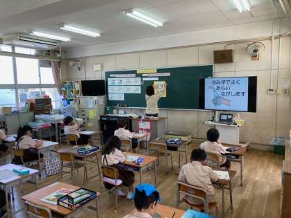 栄養教諭による給食の指導の様子です。「きまり」を守らせることで、コロナ感染対策をしています。