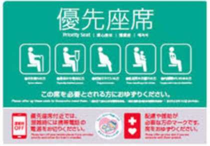 この優先座席はどういう人たちが優先して座れるのでしょうか?「お年寄り」「妊娠している人」「乳幼児を抱っこしている人」「障がいやケガをしている人」ですね。イラストなどで掲示している場合もあります。