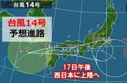 台風14号は、17日金曜午後、西日本に上陸する予想で、18日土曜にかけては西日本中心に大荒れの天気が続くことがあります。警戒をお願いします。