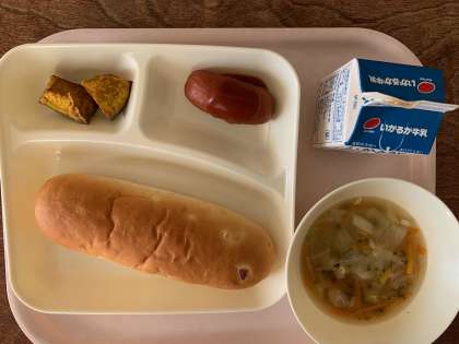 【今日の献立】おさつパン フランクフルトのケチャップソース スープ