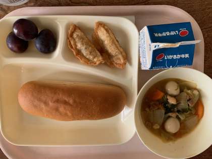 【今日の献立】黒糖パン あげぎょうざ 中華煮 ぶどう(巨峰) 牛乳