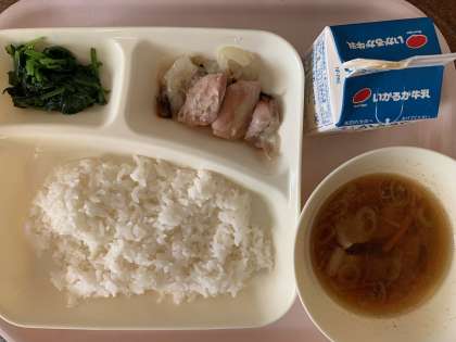 【今日の献立】ごはん 鶏肉のゆず塩焼き ソーキ汁 ほうれんそうのお