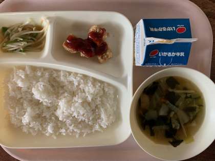 【今日の献立】ごはん まぐろのオーロラ煮 すまし汁 もやしとピーマ