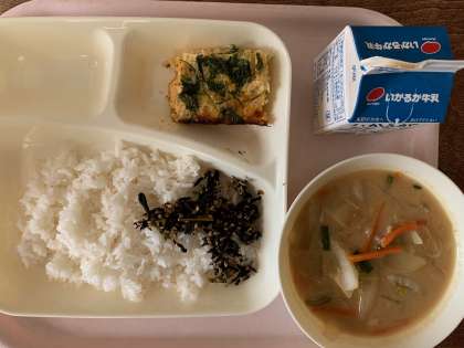 【今日の献立】ごはん 千草焼き みそ汁 ごまひじき 牛乳