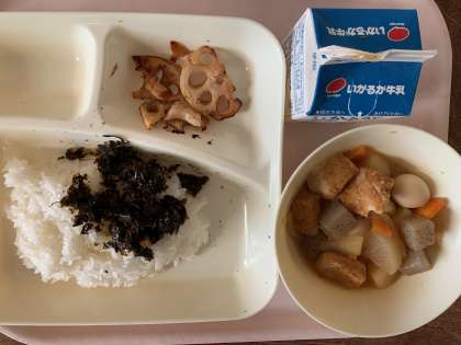 【今日の献立】ごはん 関東煮 れんこんの梅風味焼き のりのつくだ煮