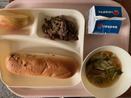 【今日の献立】レーズンパン 牛肉のオイスターソース焼き 中華スープ
