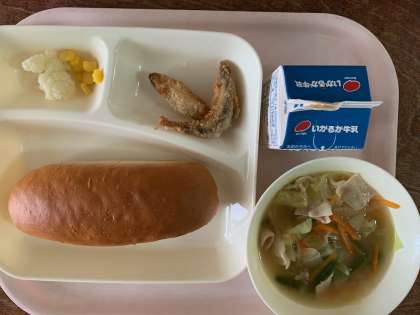 【今日の献立】黒糖パン わかさぎフライ スープ カリフラワーと