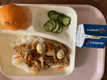 【今日の献立】中華丼 きゅうりの中華あえ みかん 牛乳