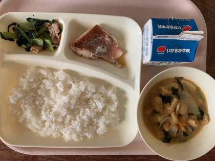 【今日の献立】ごはん あかうおのしょうゆだれかけ みそ汁 こまつな