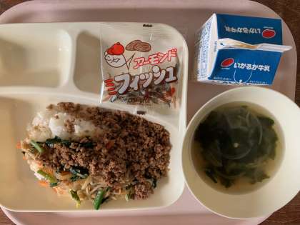 【今日の献立】ビビンバ わかめスープ アーモンドフィッシュ 牛乳