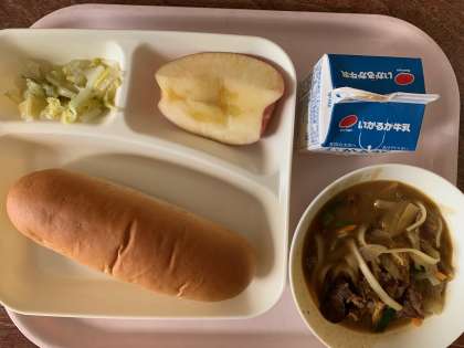 【今日の献立】黒糖パン カレーうどん はくさいの甘酢あえ りんご