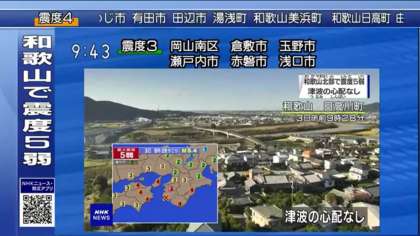 本日9時28分ころ地震がありました。震源地は紀伊水道で、津波の心配はないということです。地震情報に気を付けてください。