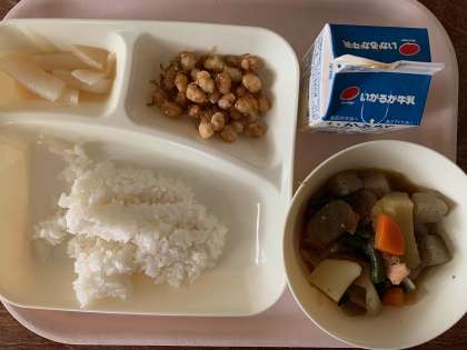 【今日の献立】ごはん 鶏肉と野菜の煮もの じゃこ豆 かぶのゆず風味