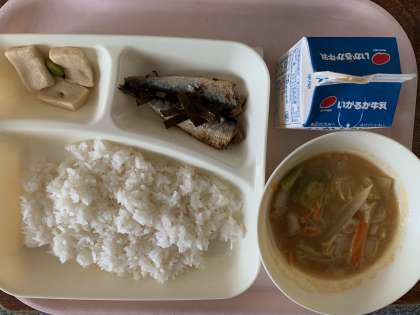 【今日の献立】ごはん いわしのしょうが煮 みそ汁 高野どうふの煮