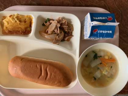 【今日の献立】コッペパン(マーガリン) 豚肉のケチャップソテー