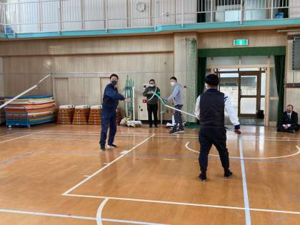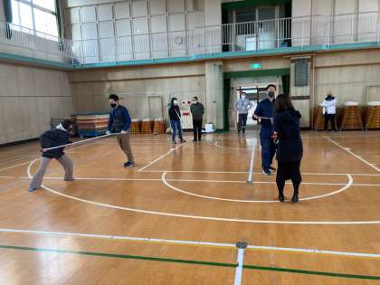 訓練後、警察の方から本日の訓練での課題などのお話や「さすまた」の使い方の練習を学びました。