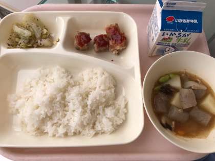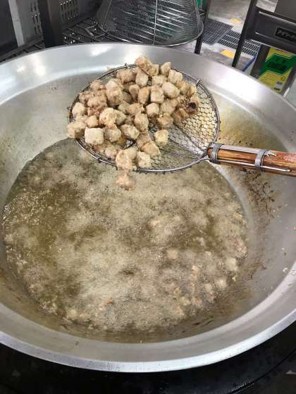 今日の給食のまぐろのオーロラ煮は、児童の皆さんに好評な献立です。下味を付けたまぐろにでんぷんをつけ、油で揚げています。それからオーロラソースを揚げたまぐろに絡ませています。とてもおいしい一品です。