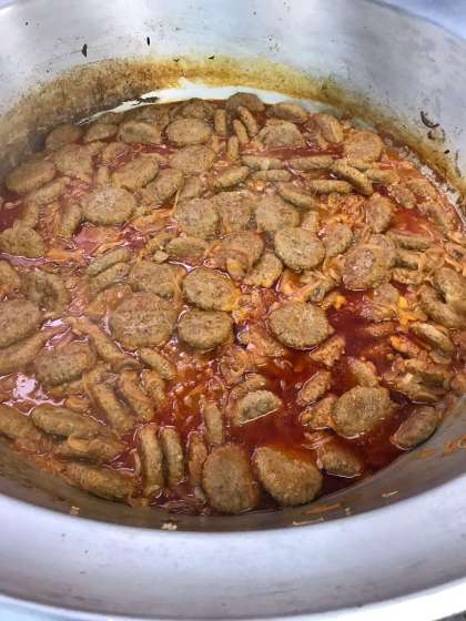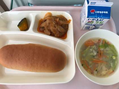 今日の献立の煮こみハンバーグは、大きな回転釜でハンバーグのソースを作り、その中に学校全員分のハンバーグを入れて煮込んでいます。たまねぎの甘さが感じられるやさしい味で、児童のみなさんもしっかりと食べられていました。