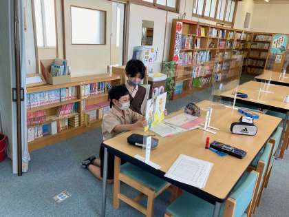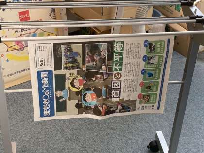 図書委員会の様子です。低学年に紙芝居をするので、読む準備をしています。子ども新聞も展示してくれました。