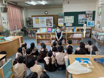 図書室で学校司書から読書についてお話しを聞いています。